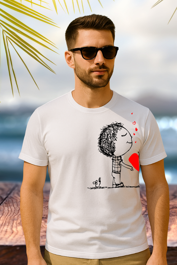 Minimalist Love Sketch White Cotton T-Shirt – Romantic Art Tee for Couples